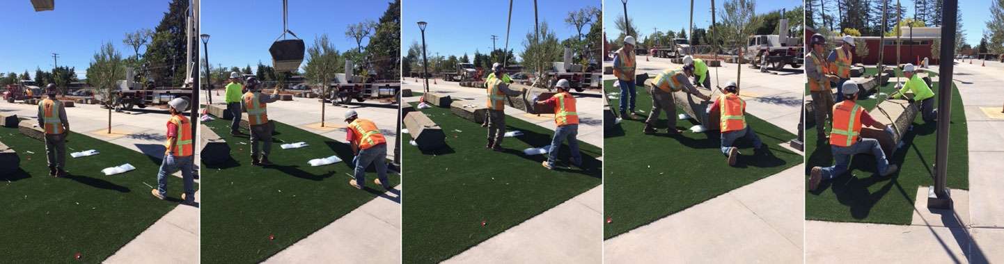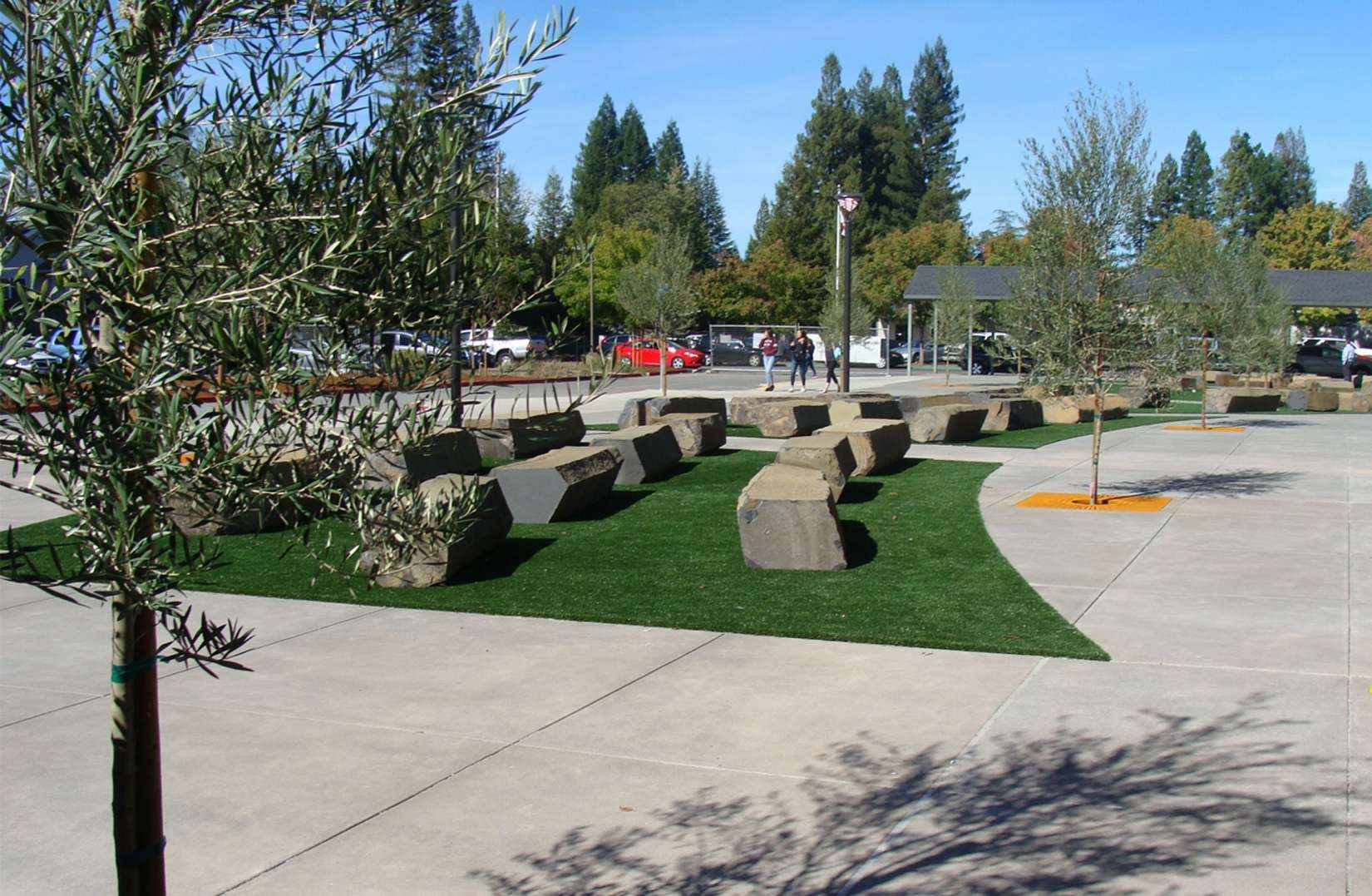 With an opportunity of this magnitude, Principal Vince Lattanzio and Senior Associate Tim Skinner (bios here) proposed a grand yet simple gesture. The administration desired an outdoor classroom with seating and gathering opportunities. As a response, the formal orchard layout of fruitless olive trees reflects the surrounding agricultural land of Sonoma County and blends harmoniously with the open plaza concept. Large freeform areas of synthetic turf soften the space and, along with neutral concrete paving, provide universal access to the entire plaza and outdoor classroom. The synthetic turf is also desirable from an educational program and maintenance perspective: it does not require irrigation or air- and noise-polluting mowers.
