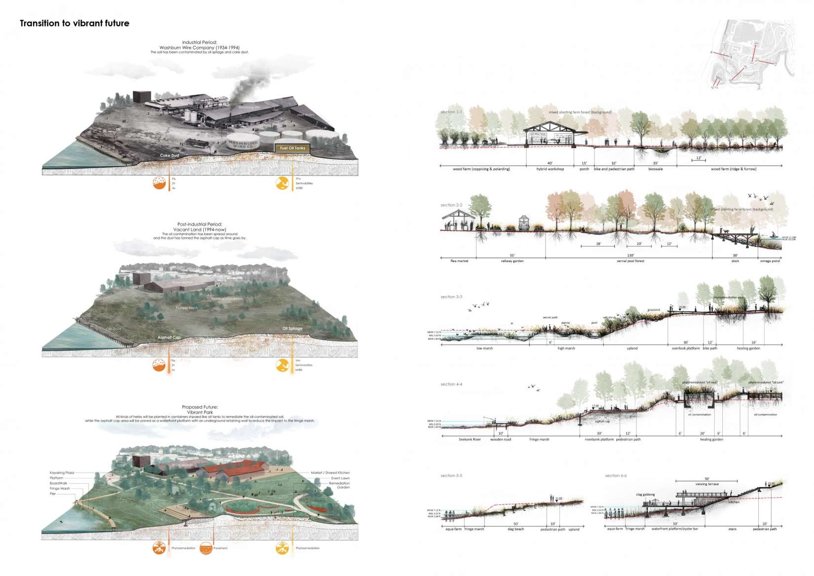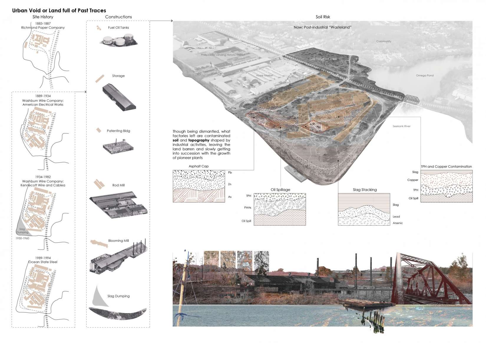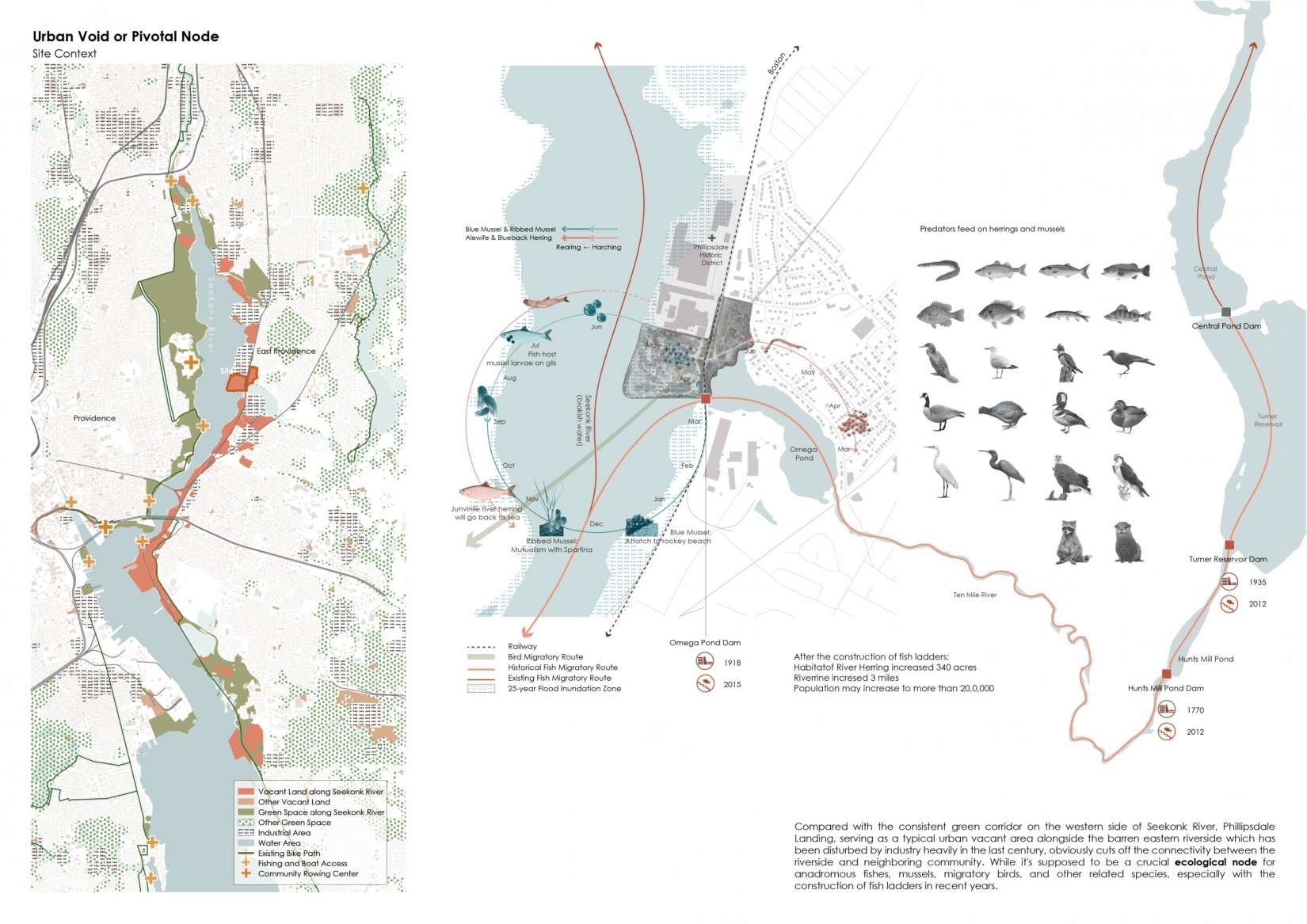 “Phillipsdale Landing has witnessed industrial developments along Seekonk River over centuries since 1860, which has been drastically shaped to a post-industrial waterfront wasteland. Though being totally dismantled, what these factories left are contaminated soil and topography shaped by industrial activities, leaving the land barren through decades while slowly getting into succession with the reoccupation of pioneer plants. Despite being a wild urban void, it is located at a crucial ecological node for both anadromous fishes and migratory birds. The question for us is how to make the voids vibrant again by bringing out its potential.