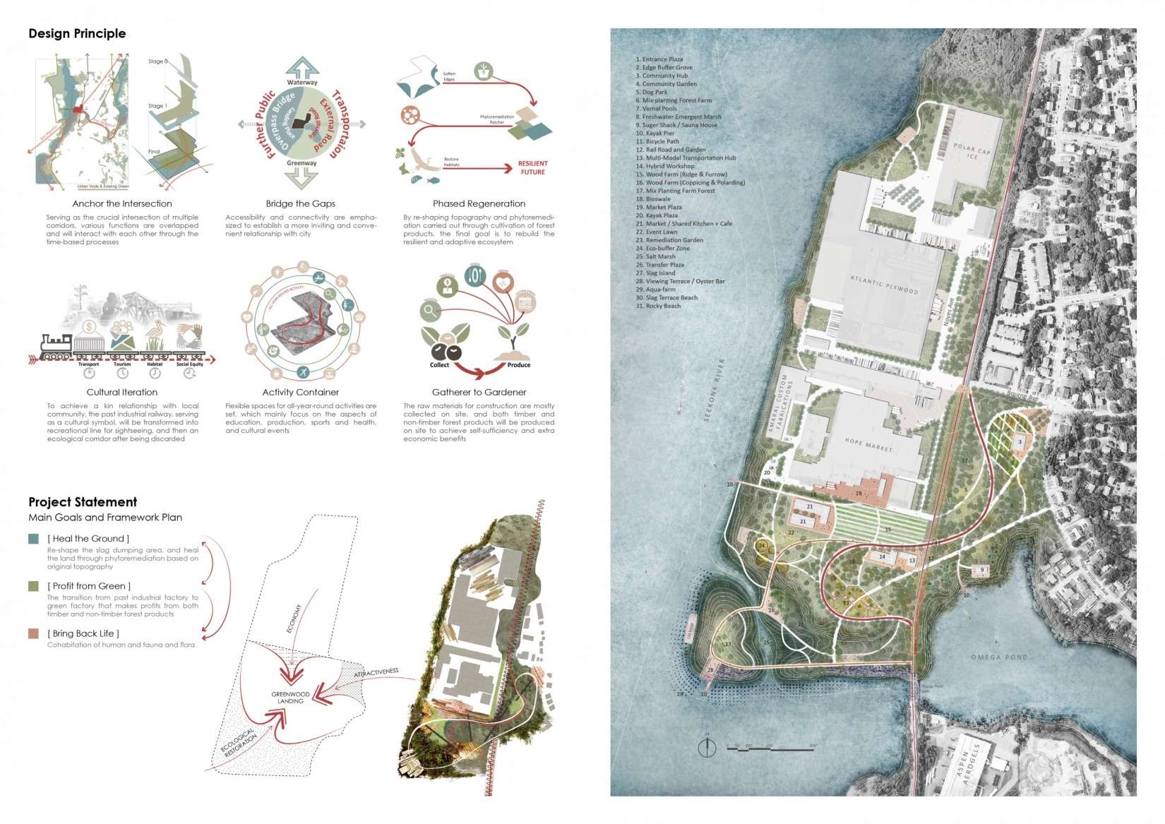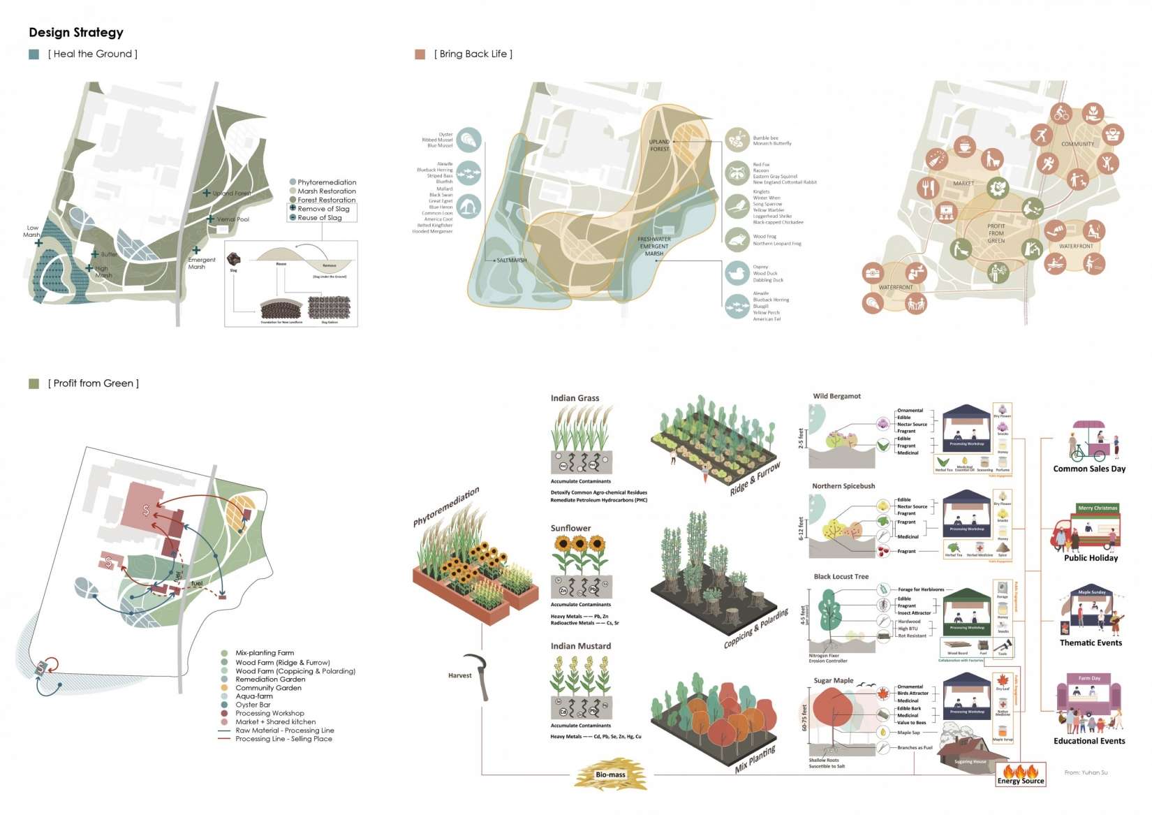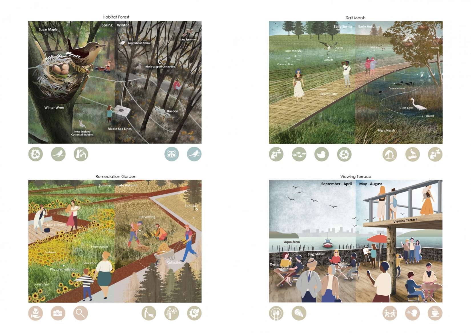 “Phillipsdale Landing has witnessed industrial developments along Seekonk River over centuries since 1860, which has been drastically shaped to a post-industrial waterfront wasteland. Though being totally dismantled, what these factories left are contaminated soil and topography shaped by industrial activities, leaving the land barren through decades while slowly getting into succession with the reoccupation of pioneer plants. Despite being a wild urban void, it is located at a crucial ecological node for both anadromous fishes and migratory birds. The question for us is how to make the voids vibrant again by bringing out its potential.
